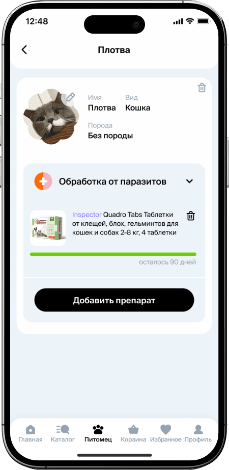 В карточке животного можно добавить несколько препаратов и указать периодичность приёма