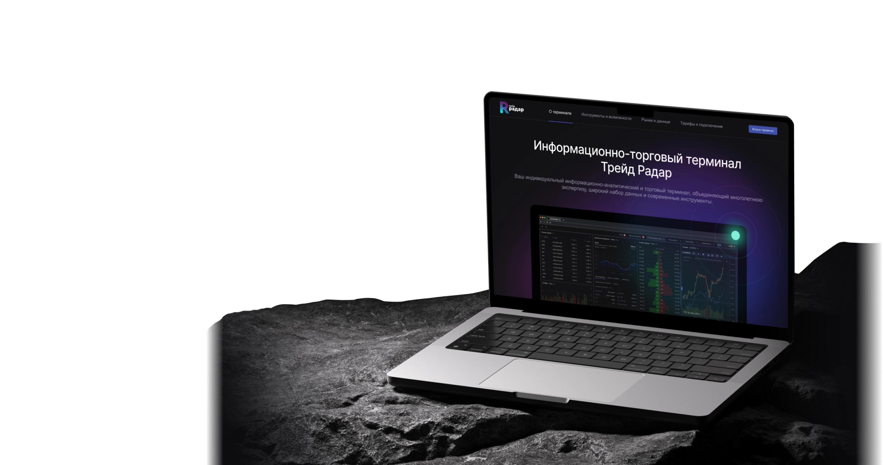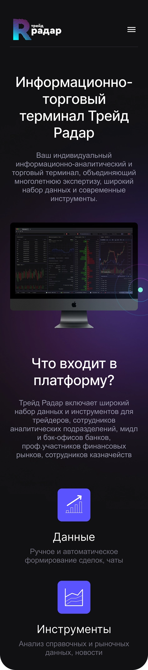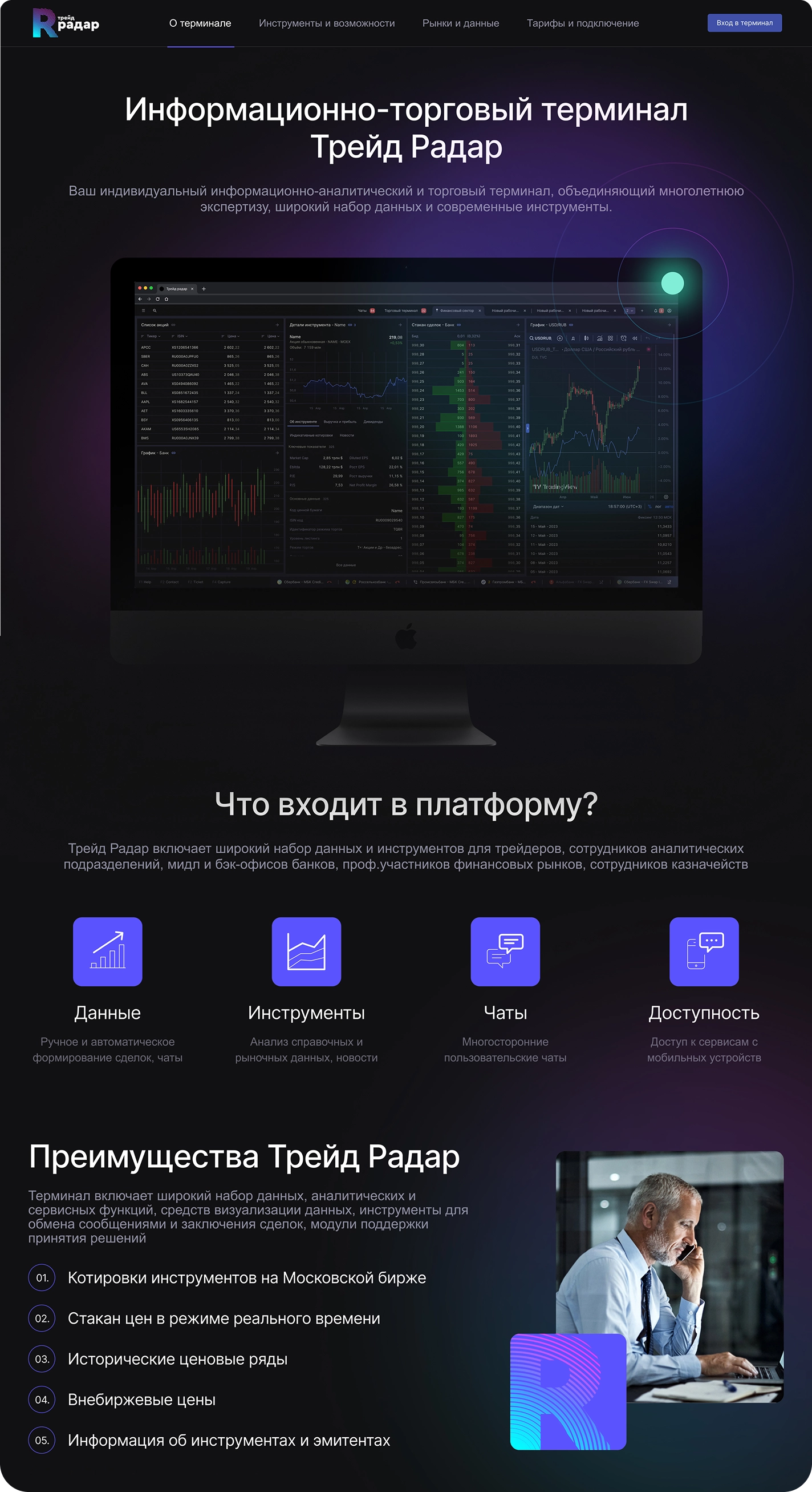 Рассказывает о сервисе, объясняет его возможности и привлекает пользователей. Вход в терминал позволяет зарегистрированным клиентам получить доступ к торговым инструментам и управлять своими сделками.