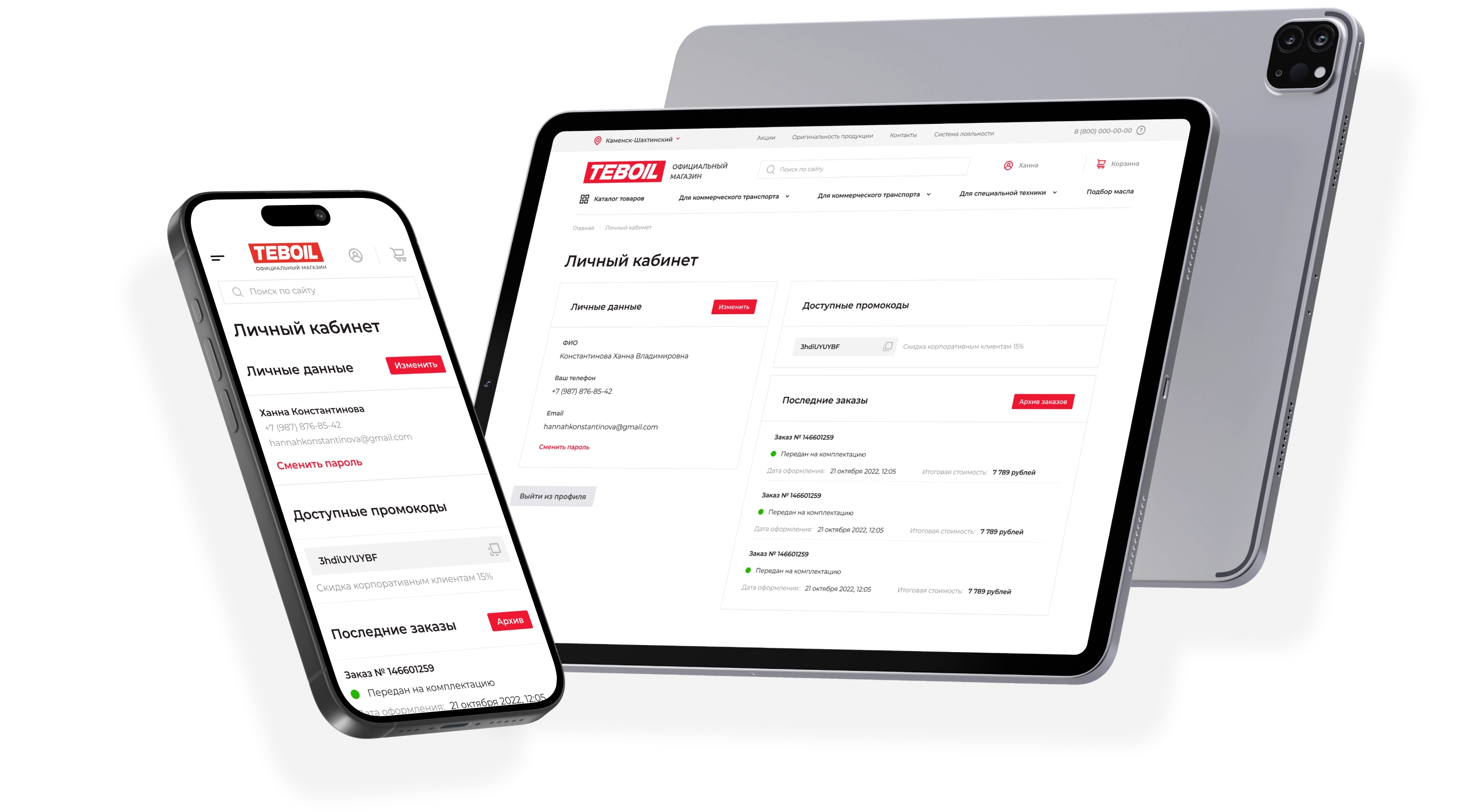 Личный кабинет с историей заказов и промокодами