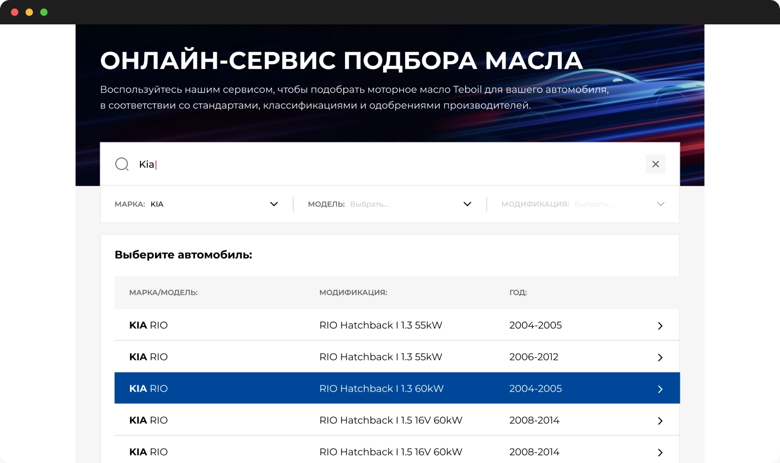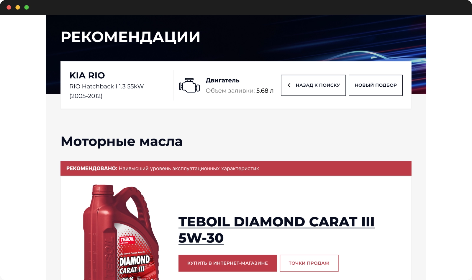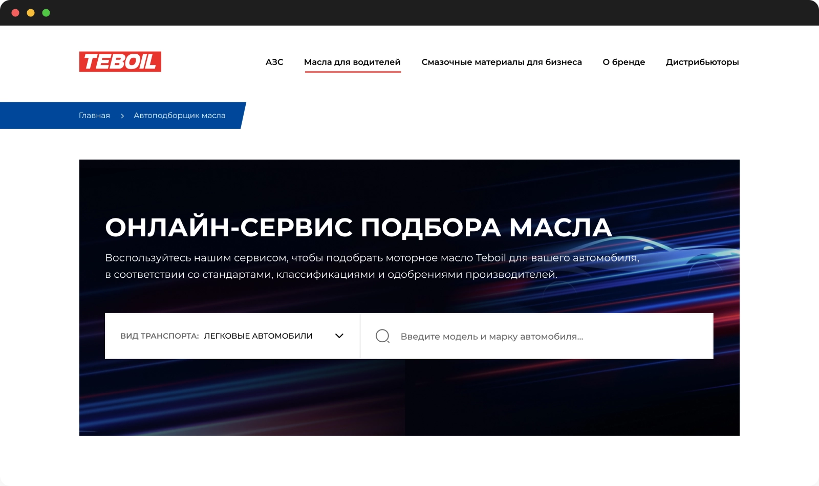 Онлайн-сервис предоставляет клиенту возможность подобрать моторное масло в зависимости от модели и характеристик автомобиля